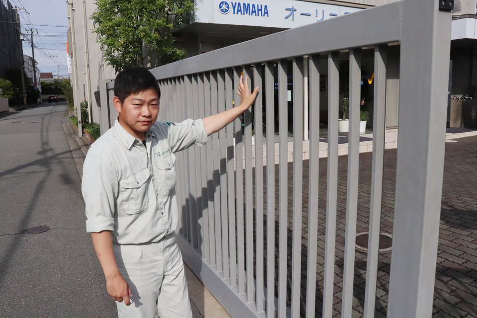 ゲート事業部で門扉やオーバードアーの点検修理を担当しています。個人邸の門扉やオーバードアーの他に、空港、学校、警察、自衛隊、大手企業の工場など、大型門扉や特殊門扉を設置している先が中心で、北は北海道から南は沖縄までと全国にまたがり、作業をおこなっています。入社当初から「小西くんが中心となって頑張ってほしい」と上司から期待をかけてもらい、2ヶ月目には空港にある110mもの門扉のメンテナンスに同行して学ばせてもらいました。2年目からは既存のお客様の定期点検も担当するようになり、ほとんど外出していますね。多い時は1日4~5件こなすことも。ときには他社製品も見てほしいという依頼がきたり、数は少ないですが、自動ドアや食品加工施設の防熱扉の保守点検もおこなったりしています。既存のお客様のメンテナンスや突発の修理依頼で予定がほぼ埋まってしまうというのが現状ですね。