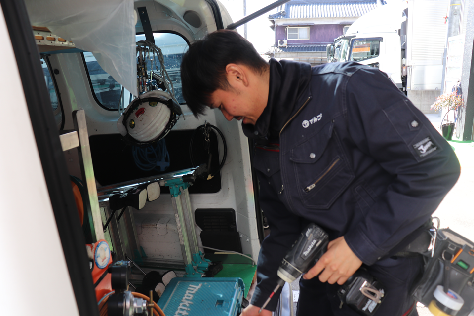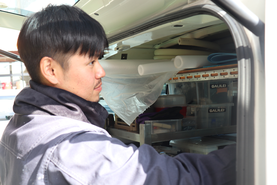 心に残っていることは、入社直後の新入社員研修で、社会人と学生の違いを学んだこと。学生のときは先生から課題を出されていましたが、社会人の場合は、常にお客様の声に耳を傾け、その声に対応していくことが仕事であり、それが課題だと教わりました。今まさに日々体感しています。出来なかったことが1つずつ出来るようになり、仕事を通じて自分自身の成長を実感できるのが何よりうれしいですね。また、「ありがとう」と直接お客様から感謝の言葉をいただくときも、やりがいを感じます。先輩は、作業の最後には必ず手形の後をふき取るなど、プラスαの心遣いを意識されているので、僕も見習おうと思っています。今は先輩について教わりながら一緒に作業させていただく立場ですが、1つ1つ確実に吸収して、次は1日でも早く僕が後輩を教えられるようになることを目標にしています。