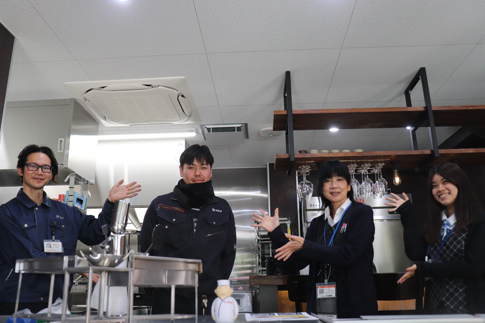 飲食店開業に向けた店舗改装の空調工事や吸排気のダクト工事、厨房機器の搬入設置や機器の修理メンテナンスなどを担当しています。扱っている商品の数が多い分、覚えることもたくさん。今はまだ先輩に同行しながら学んでいる最中で、地元はもちろん京阪神や四国に行くこともあります。また、合間を縫って、機器メーカーの研修への参加や、資格取得にも挑戦しています。先日も第一種電気工事士の筆記試験に合格し、今は次の実技試験に向けて練習しているところです。入社半年が経った頃から、家庭用のルームエアコン程度なら1人で取り付けられるようになり、徐々に1人でできる作業が増えてきたことに喜びを感じています。コロナ禍で大学に行くこともなく時間を持て余していた学生時代に比べると、社会人になってからは学びの連続。オンオフのメリハリがあって充実しています。