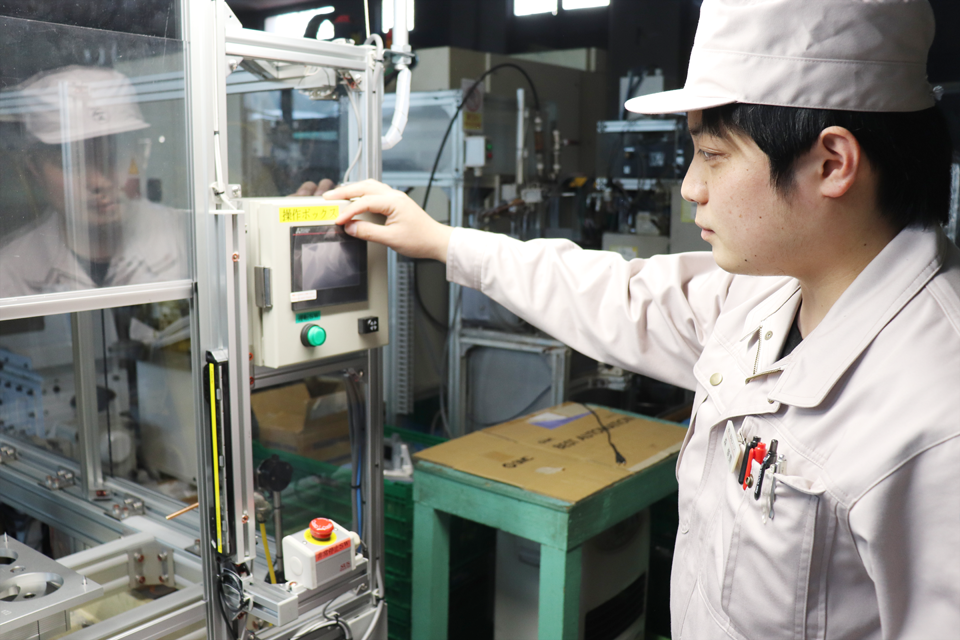 大学では知能機械工学科に所属し、ロボットを使った研究をしていました。4年間で学んだことを活かせる仕事を探していたところ、合同説明会で出合ったのが多田スミスです。ガス製品や給湯機など、自宅でも使用する身近なものを作っている点に興味をもちました。また、転勤がないことや、地元である岡山にもすぐに帰れる距離であることも、自身の条件にマッチ。初めて会社を訪問した際は、自動で加工や組み立てを行っているラインを見学させていただきました。一気に働くイメージが湧いたと同時に、ここでなら得意分野を伸ばして成長できると思いました。実際、現在作成中の生産ラインの自動化では、治具の図面を描いたり、ロボットにセンサーを使ったり、大学時代の知識や経験を活かしながらチャレンジできていると実感しています。